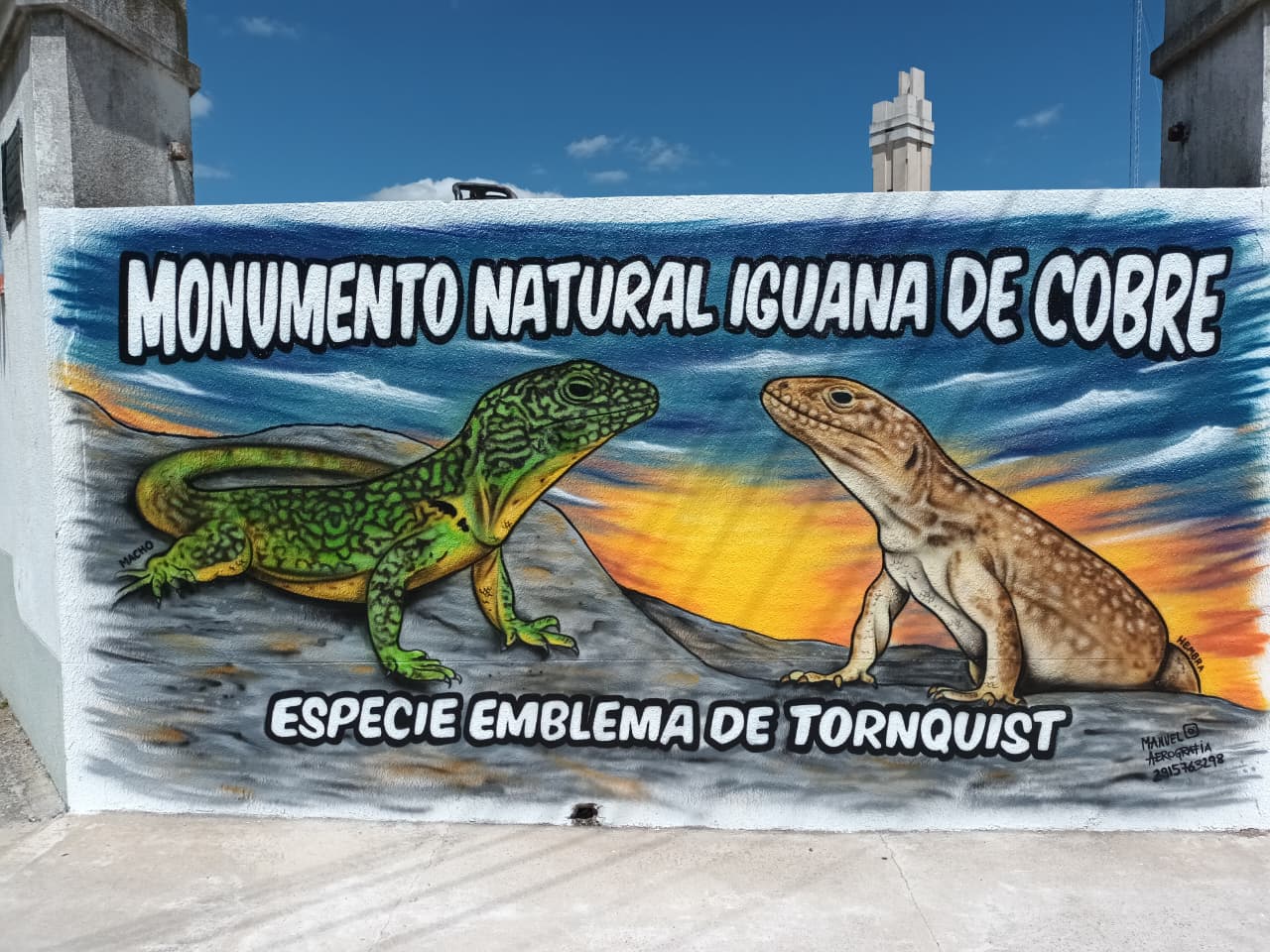 La obra representa un macho y una hembra de iguana de cobre, con el objetivo de que la comunidad pueda reconocerlos y valorar su presencia. “Quería llegar a la gente de Tornquist, siendo que es una esquina tan transitada”, explicó Aníbal. “Me habían cedido la esquina hace mucho tiempo y por diferentes cuestiones no lo podíamos concretar. Hace 15 días me fui a rasquetear, a pintarla bien de blanco y que esté en condiciones. Manuel, en una tarde y una mañana, superó ampliamente las expectativas”.