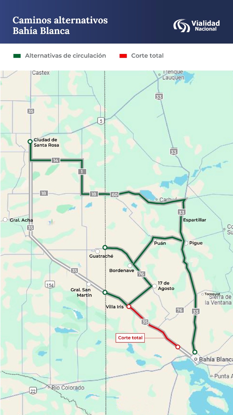 Desde La Pampa por RN 35 hasta el acceso a Villa Iris. Continuar por RP 76 hacia 17 de Agosto y Bordenave para luego dirigirse a Púan. Desde allí, tomar la RP 67 hasta Pigüé. En la rotonda, seguir en dirección a RN33 hacia Bahía Blanca. En sentido inverso desde Bahía Blanca.
