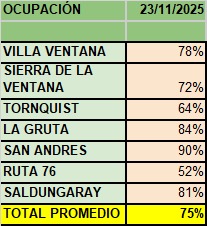 El cuadro estadístico muestra un promedio general de ocupación del 75% para todo el partido, reflejando el atractivo de la región para los visitantes. Algunas localidades se destacaron significativamente: