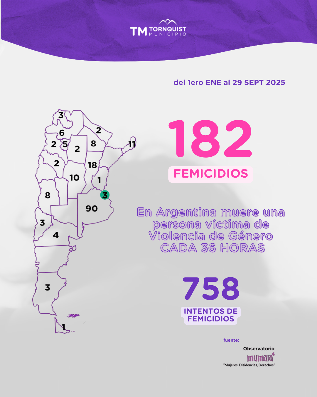 Finalmente, el equipo interdisciplinario comparte los números publicados por el Registro Nacional de Femicidios que comprenden los hechos sucedidos entre el 1 de enero y el 30 de septiembre del corriente año. En lo que va del año, ocurrieron 182 femicidios de mujeres, lesbianas, travestis y trans. Esto representa una muerte en Argentina por violencia de género cada 36 horas. 141 de esos Femicidios fueron directos, 16 muertes fueron vinculadas, 16 fueron por narcotráfico o crimen organizado, 7 fueron suicidios femicida, 1 lesbicidio, y 1 trans/travesticidio. Además, ocurrieron 758 intentos de Femicidios y 22 muertes se encuentran en investigación.
