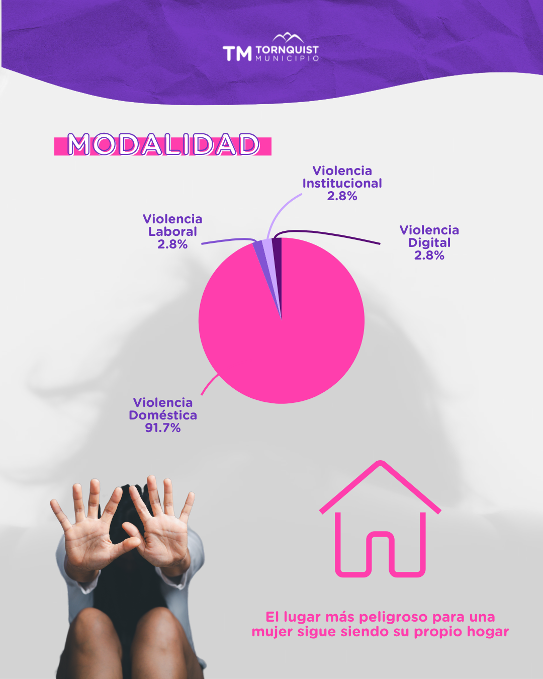Las modalidades de la violencia por razones de género representan los ámbitos en los que se ejercen estas violencias. El 91.7 % de las situaciones sucedieron en el ámbito doméstico, dejando en claro que el lugar más peligroso para una mujer es su propio hogar. También se registraron situaciones de violencia por razones de género en el ámbito laboral, institucional y digital.