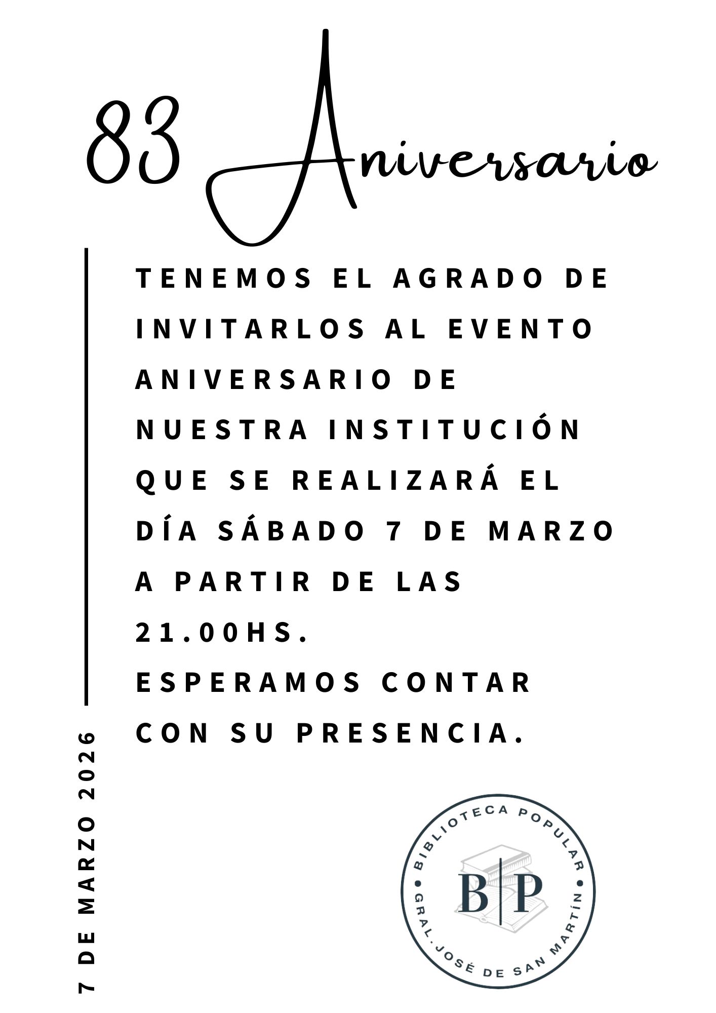 Desde la Biblioteca expresaron el agrado de invitar a todos los socios y allegados, destacando que esperan contar con una amplia presencia para soplar las 83 velitas de un espacio que es pilar fundamental de la identidad de Saldungaray.