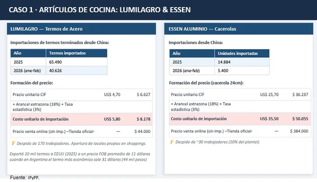 Essen: importa cacerolas de China con un costo unitario (incluyendo fletes e impuestos) de unos $50.000. En sus canales de venta se ofrecen a $384.000 (sin contar impuestos nacionales). Despidió 30 trabajadores.