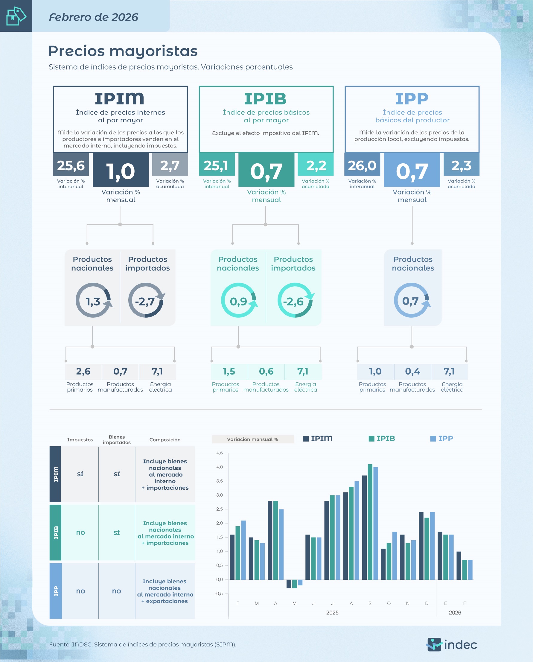 Esta suba del indicador fue la segunda más baja desde mayo de 2025 (cuando había registrado una baja del 0,3%). A su vez, es la tercera ocasión desde junio de 2020 en que el índice de precios internos al por mayor (IPIM) muestra una variación mensual del 1% o menor.