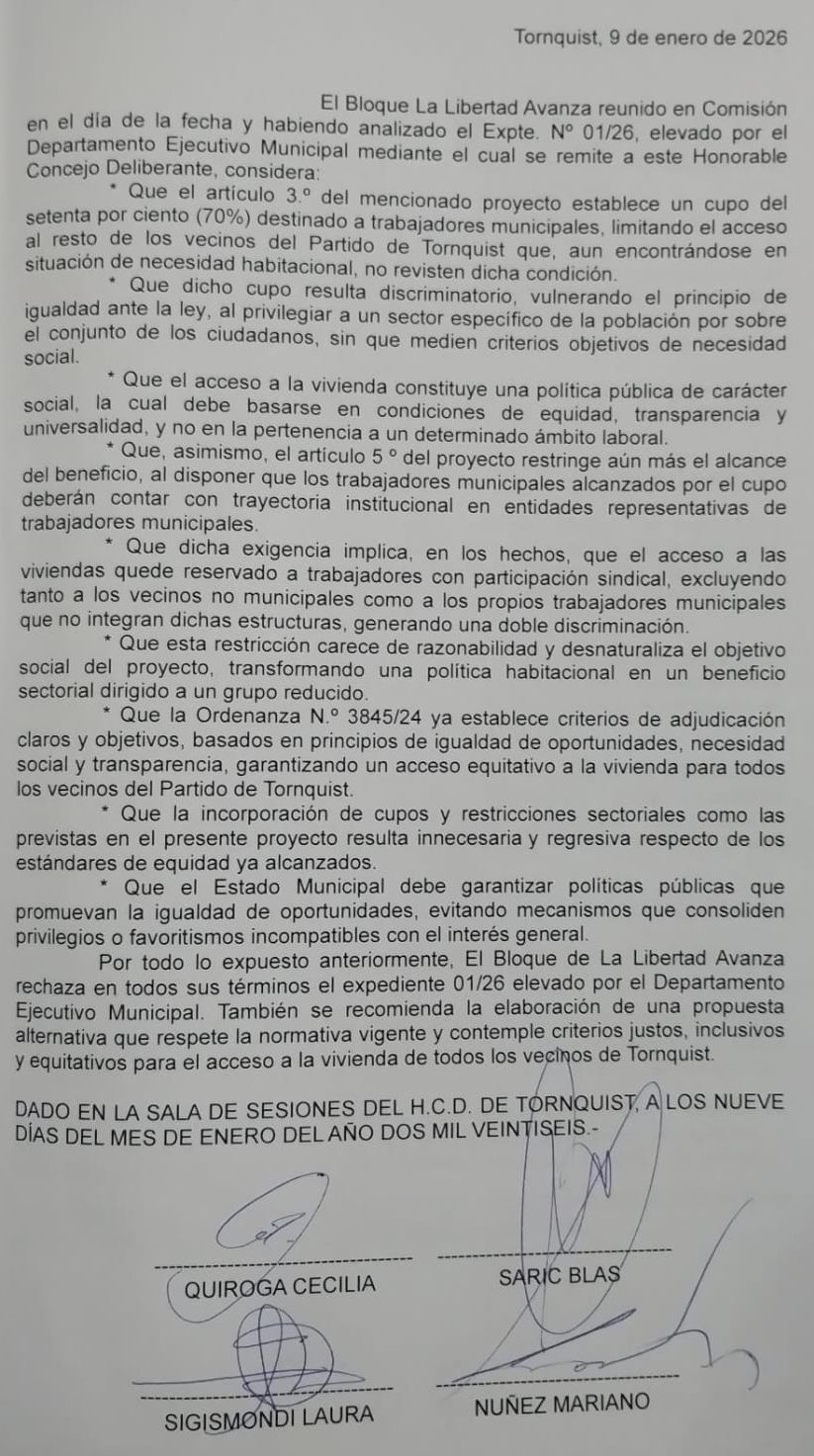El bloque libertario se opone al expediente municipal que destina un 70% de las viviendas a empleados de la comuna. Denuncian que la medida privilegia a sectores con participación sindical, vulnera la igualdad ante la ley y contradice las ordenanzas de transparencia vigentes en el distrito.