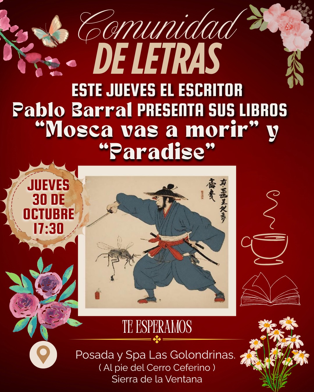 El ciclo «Comunidad de Letras» de Sierra de la Ventana recibirá este jueves 30 de octubre a las 17:30 horas al escritor y vecino Pablo Barral, quien presentará sus libros “Mosca vas a morir” y “Paradise”. El encuentro se llevará a cabo en la Posada y Spa Las Golondrinas, ubicada al pie del Cerro Ceferino.