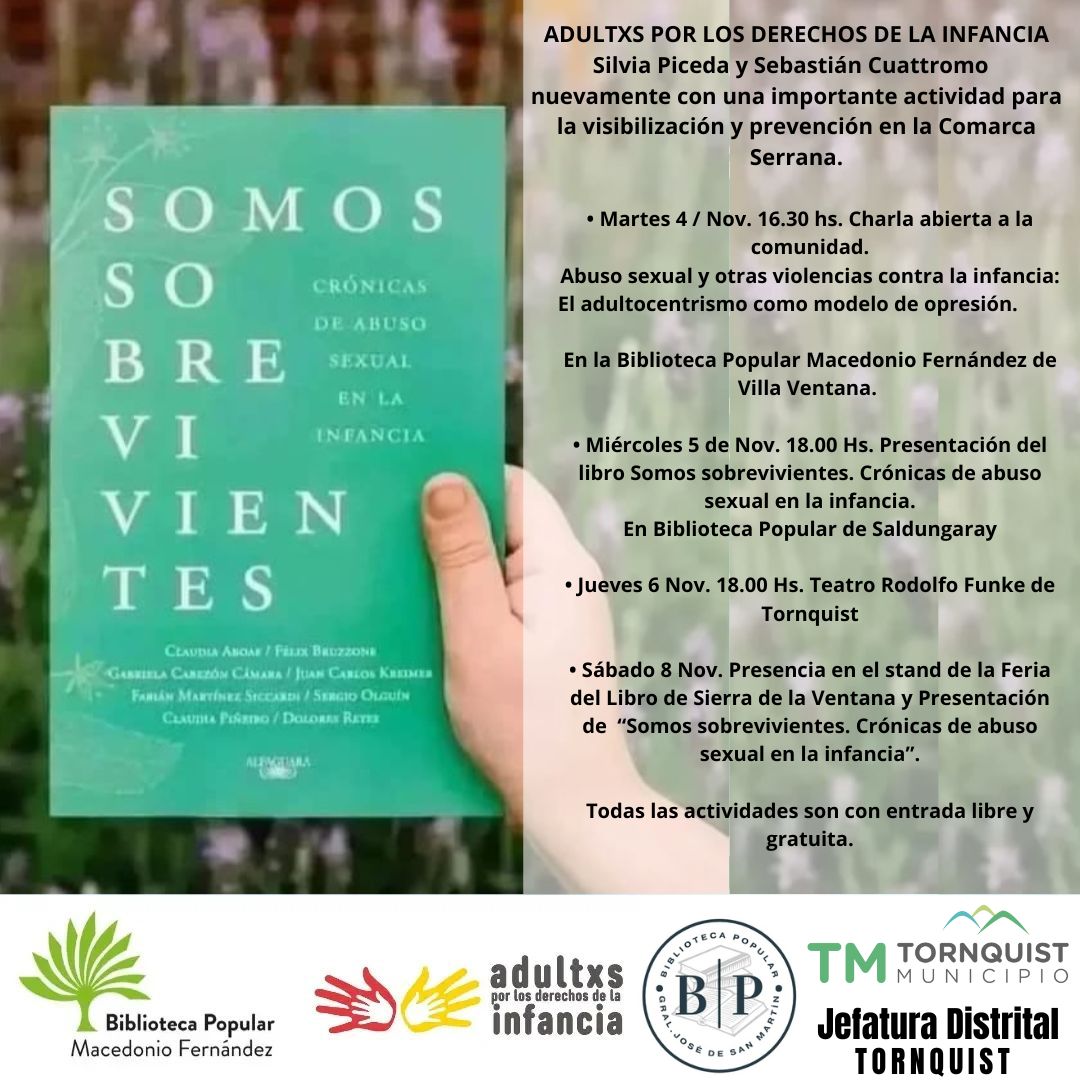 La organización Adultxs por los Derechos de la Infancia, representada por Silvia Piceda y Sebastián Cuattromo, llevará a cabo un importante ciclo de actividades en la Comarca Serrana con el objetivo de visibilizar y prevenir el abuso sexual en la infancia. El eje central de la propuesta es el libro «Somos Sobrevivientes: Crónicas de abuso sexual en la infancia».