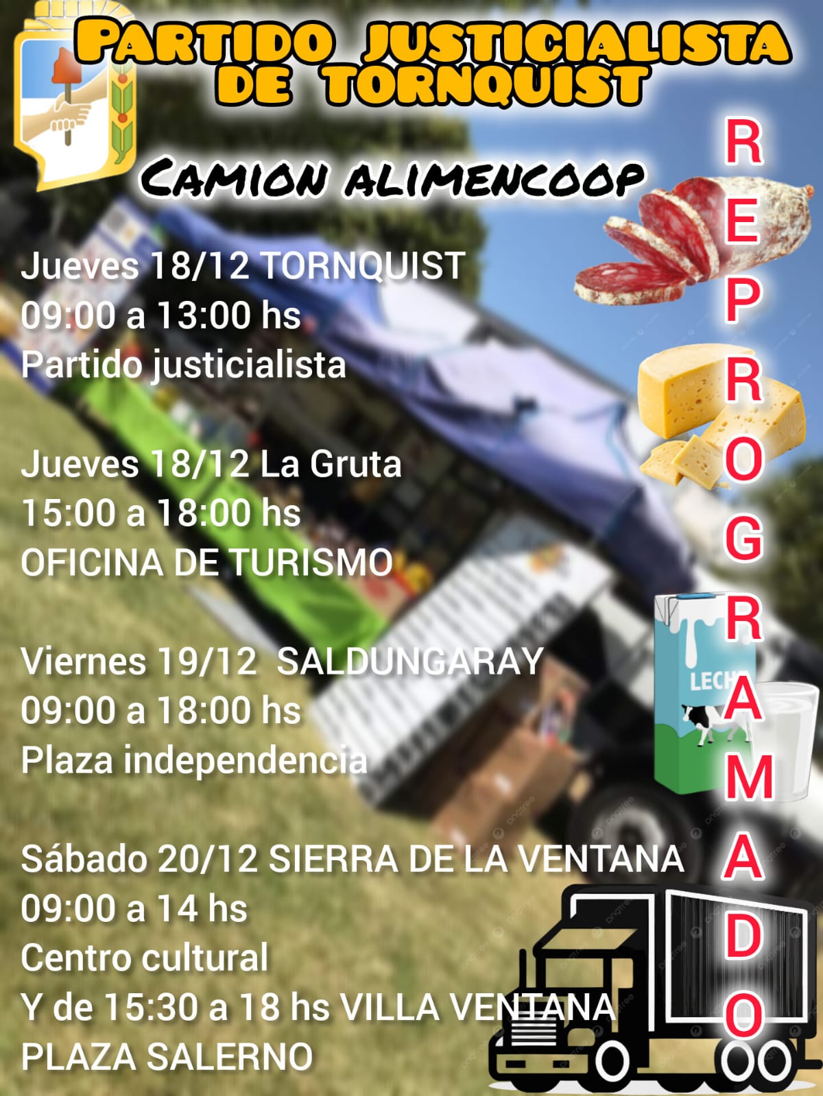 El camión de alimentos cooperativos del Partido Justicialista de Tornquist tendrá una extensa recorrida por la Comarca de Sierra de la Ventana entre el jueves 18 y el sábado 20 de diciembre.