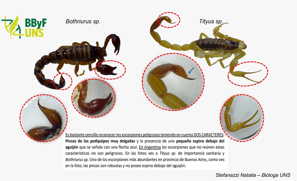 «Tenemos que hacer referencia a las pinzas, que los que tenemos en nuestra zona, sus pinzas son cortas y robustas» explicó Natalia cómo identificar a los no peligrosos. Mencionó que los que son de importancia sanitaria cuentan con pinzas muy finas y delgadas, y que en su aguijón cuentan con un apófisis, una especie de espina que puede aparentar ser un segundo aguijón. Aunque Natalia vuelve a resaltar que en nuestra zona no hay escorpiones peligrosos.
