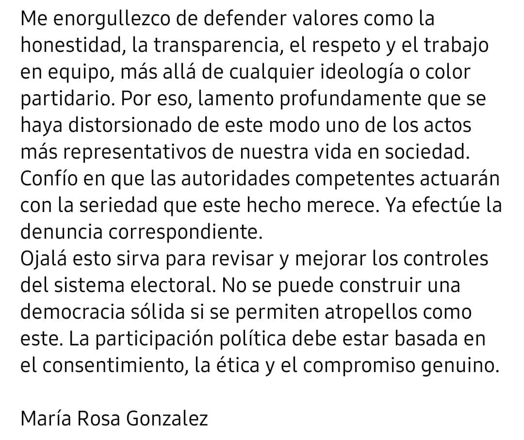 Mi nombre ha sido utilizado sin mi consentimiento para integrar una lista electoral del espacio La Libertad Avanza, como representante del PRO, lo cual no solo constituye una falta de respeto hacia mi persona, sino también una vulneración grave del proceso electoral.
