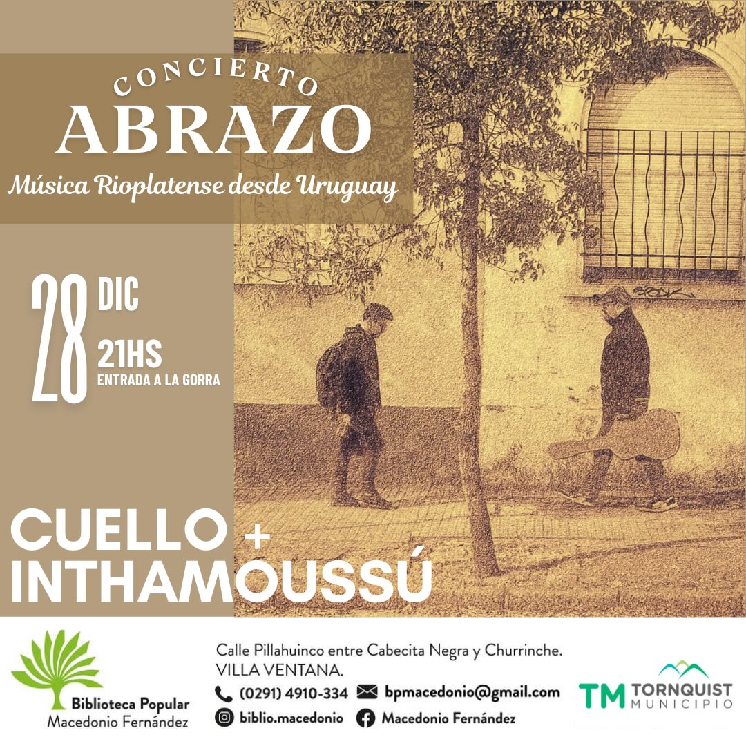 Este domingo, la Biblioteca Macedonio Fernández abre sus puertas para recibir a «Abrazo», una propuesta artística que nace de la amistad y la trayectoria compartida entre Rodrigo Inthamoussú, llegado directamente desde Uruguay, y Fernando Cuello, uruguayo radicado actualmente en Bahía Blanca.