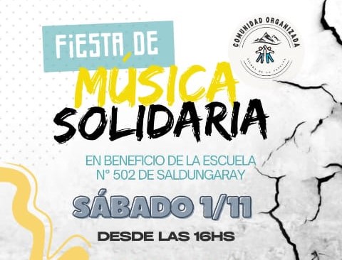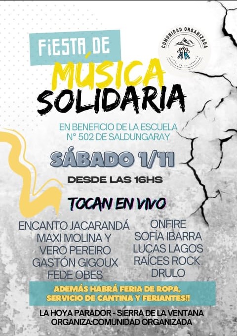 La comunidad de Sierra de la Ventana se une en una fiesta de música solidaria para beneficiar a la Escuela Especial N° 502 de Saldungaray. El evento, organizado por Comunidad Organizada, tendrá lugar el sábado 1 de noviembre a partir de las 16 horas en el «Parador La Hoya».