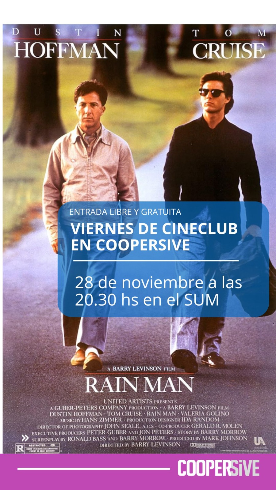 Protagonizada por los gigantes de Hollywood, Dustin Hoffman y Tom Cruise, esta conmovedora historia, dirigida por Barry Levinson, ganó múltiples premios de la Academia y es considerada un clásico del cine. La cita es en el SUM de CooperSive a las 20:30 hs, con la gran noticia de que la entrada es libre y gratuita. Una oportunidad única para ver o revivir esta joya cinematográfica en pantalla grande. ¡Te esperamos!