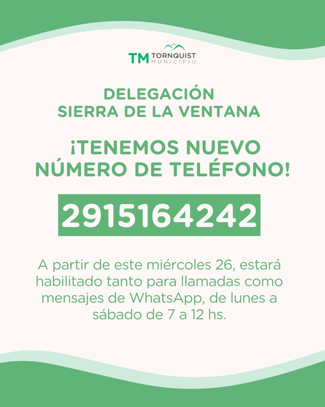 Tornquist Municipio informa que, a partir de este miércoles 26, la Delegación Municipal de Sierra de la Ventana contará con un nuevo número de teléfono de contacto.