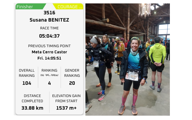 Susana Benítez del grupo de entrenamiento Huella Serrana de Sierra de la Ventana, fue de la partida en la distancia 33,8K con 1537m de desnivel positivo, que se desarrolló hoy viernes. Con un clima para nada alentador, con baja temperatura, lluvia, nieve y un terreno muy técnico, Susi pudo hacerse en un tiempo de 5:04:37 hs del cuarto puesto en la categoría 35-39, quedando 20 entre las damas y 104 en la general.
