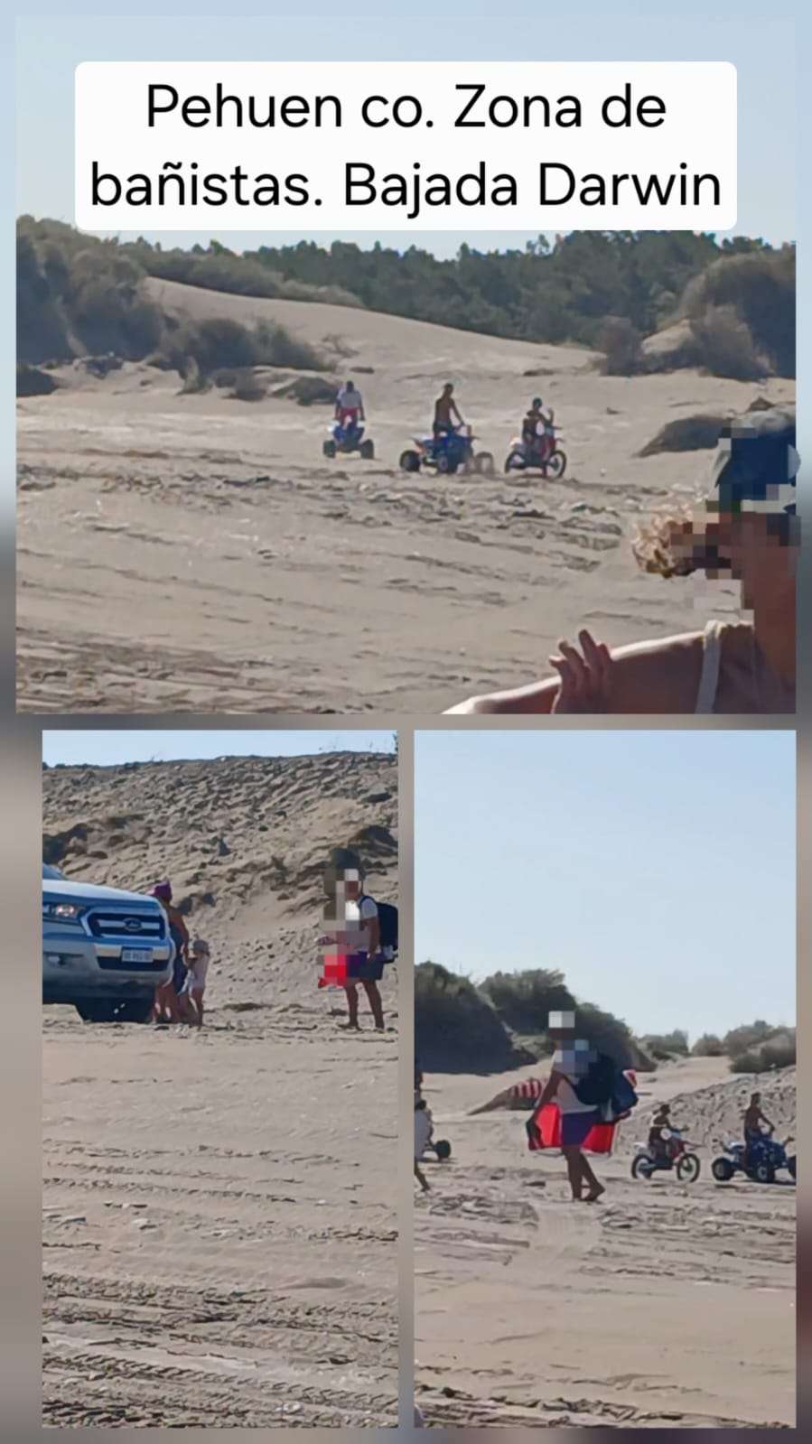 En la localidad de Pehuen Co, al Sudoeste de la Provincia de Buenos Aires, también sufrimos esas escenas todos los días, en algunas playas. Motos haciendo picadas (aunque individuales, yendo a velocidad por la playa), cuatriciclos y UTV, practicando piruetas en dos ruedas entre la gente y circulando en los médanos (por donde bajan los bañistas), niños manejando estos vehículos, sin siquiera los elementos mínimos de seguridad.
