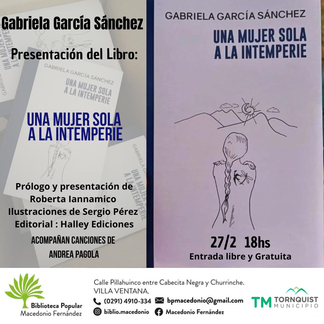 La Biblioteca Popular Macedonio Fernández tiene el agrado de invitar a la comunidad a la presentación del nuevo libro de la escritora Gabriela García Sánchez, titulado “Una mujer sola a la intemperie”.
