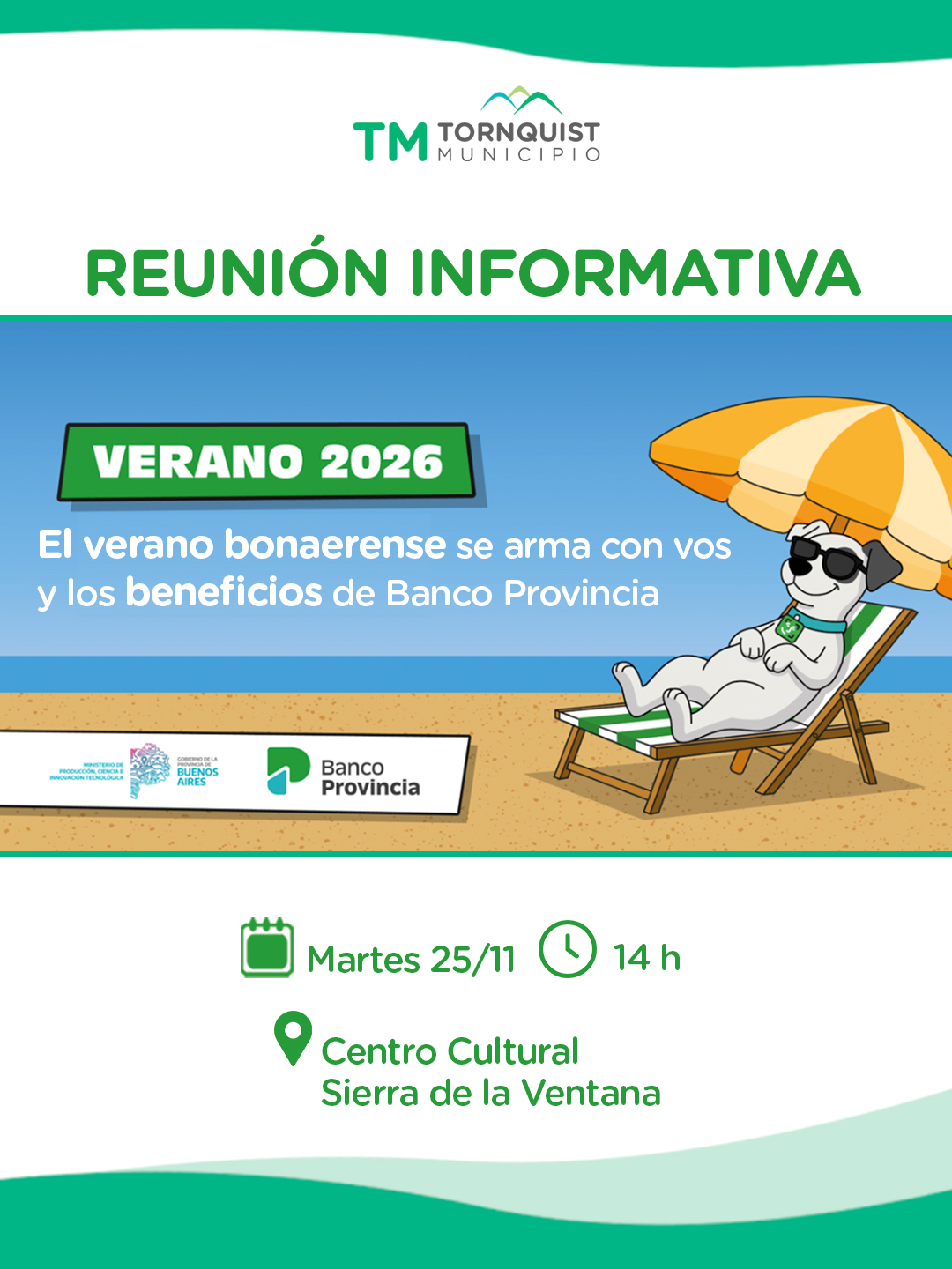 El Secretario de Turismo de Tornquist Municipio, Carlos Lamas, anunció una reunión informativa para prestadores turísticos del distrito, en el marco de una propuesta de promoción impulsada por el Banco Provincia. El encuentro será el martes 25 a las 14 hs en el Centro Cultural de Sierra de la Ventana, y busca ampliar el alcance de los beneficios a prestadores turísticos grandes, medianos y pequeños.