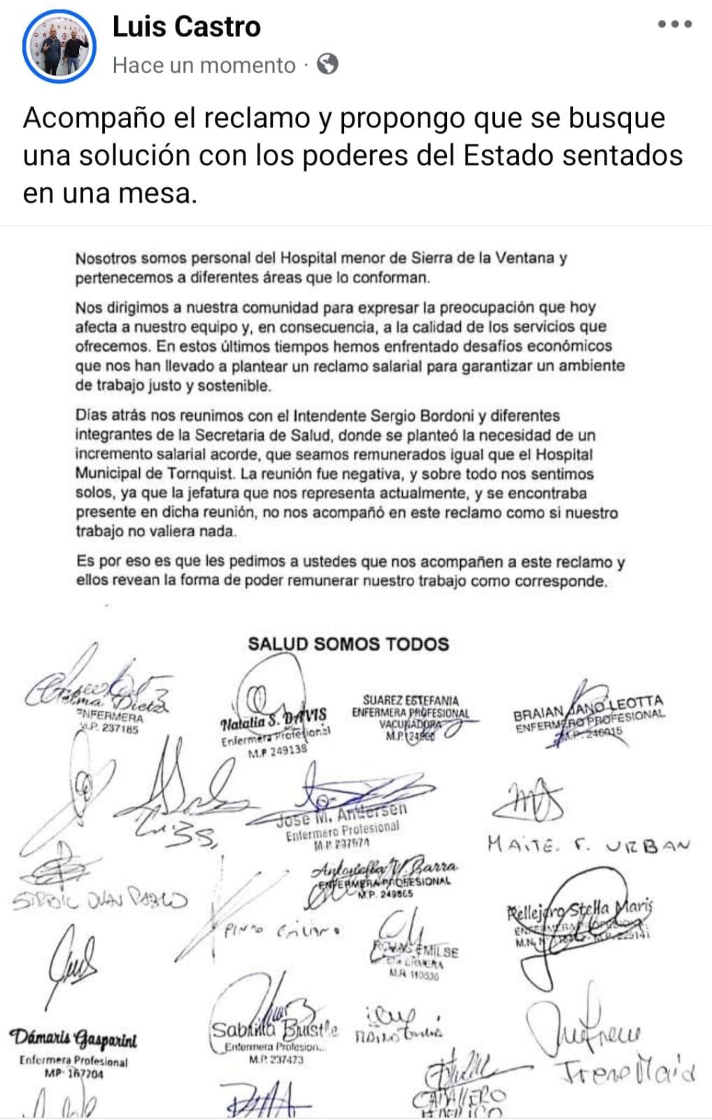 El personal de salud del Hospital Menor de Sierra de la Ventana lanza un fuerte reclamo salarial y exige que sus remuneraciones se equiparen a las del Hospital de Tornquist, denunciando «desafíos económicos» y el abandono de su jefatura. En respuesta, el concejal Luis Castro acompañó la demanda y propuso «buscar una solución con los poderes del Estado sentados en una mesa» para garantizar un ambiente de trabajo justo y sostenible.