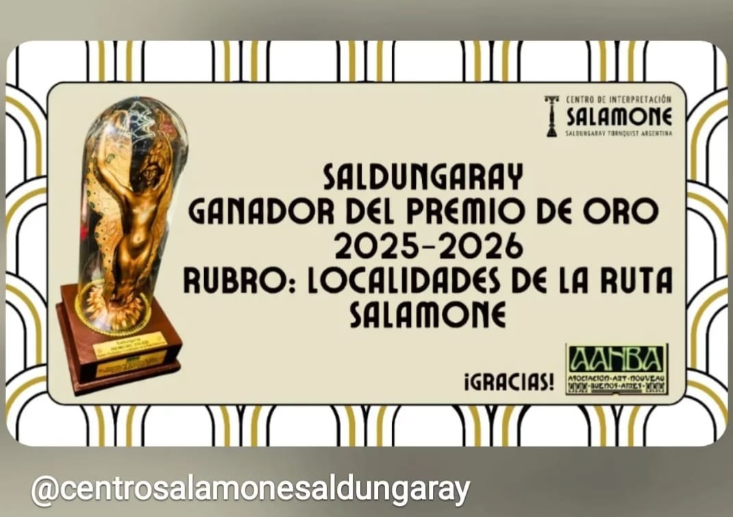 Constanza Del Río, encargada del Centro de Interpretación de Salamone en Saldungaray celebró la obtención del Premio de Oro 2025-2026 en el rubro Localidades de la Ruta Salamone. El galardón, otorgado por la Asociación Art Nouveau Buenos Aires (AANB), destaca la preservación y difusión de la obra del «Arquitecto de las pampas» en el distrito de Tornquist.