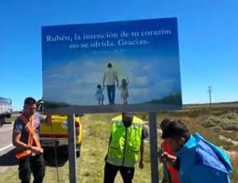 Las autoridades de Bahía Blanca colocaron una gigantografía que muestra a Rubén Salazar tomando de la mano a las hermanas Pilar y Delfina Hecker, en el ingreso a la localidad de Daniel Cerri, una de las más afectadas por el histórico temporal.