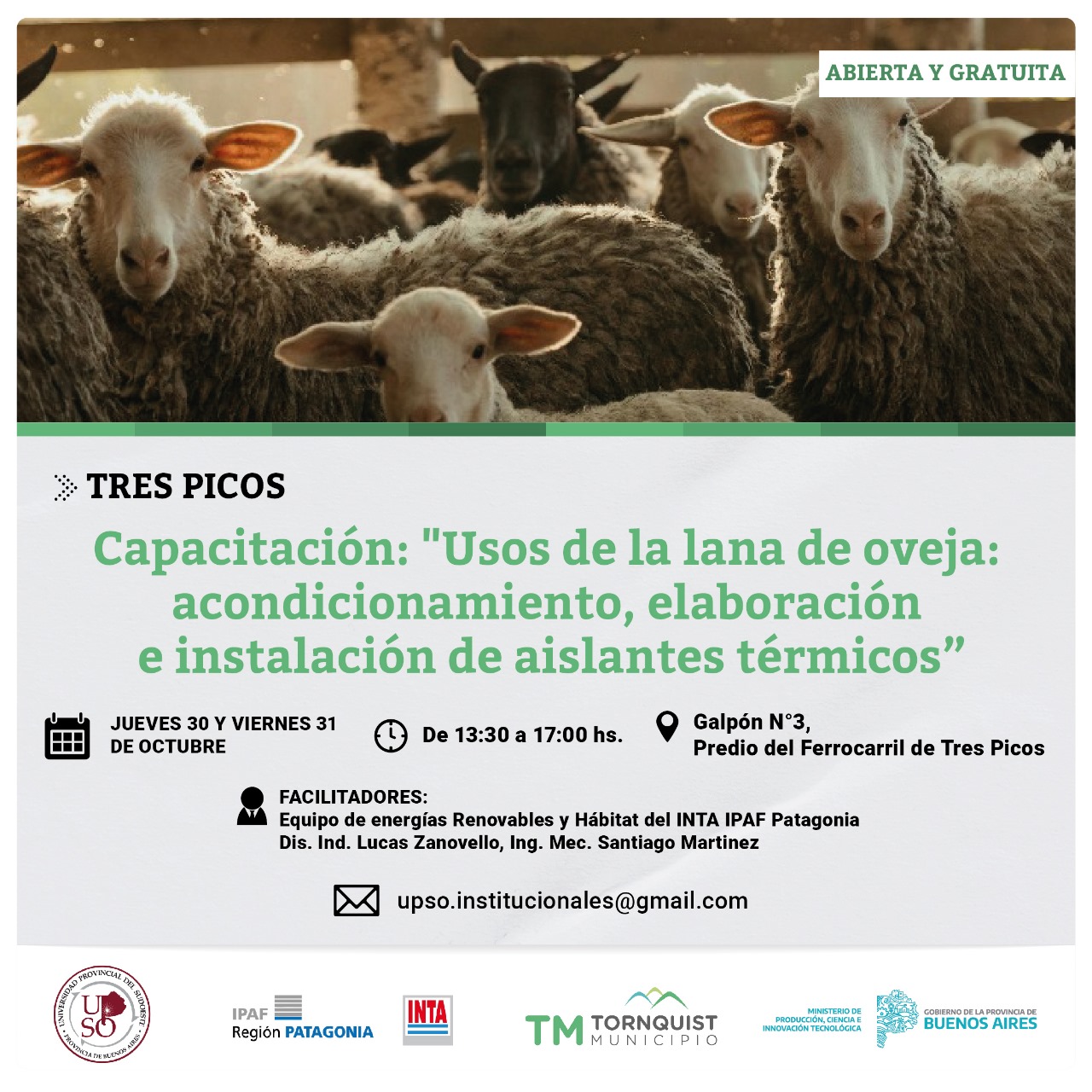 La capacitación ‘Usos de la lana de oveja: acondicionamiento, elaboración e instalación de aislantes térmicos’, se llevará adelante los días 30 y 31 de octubre en Tres Picos, en el Galpón Nº 3 de la Estación del Ferrocarril.