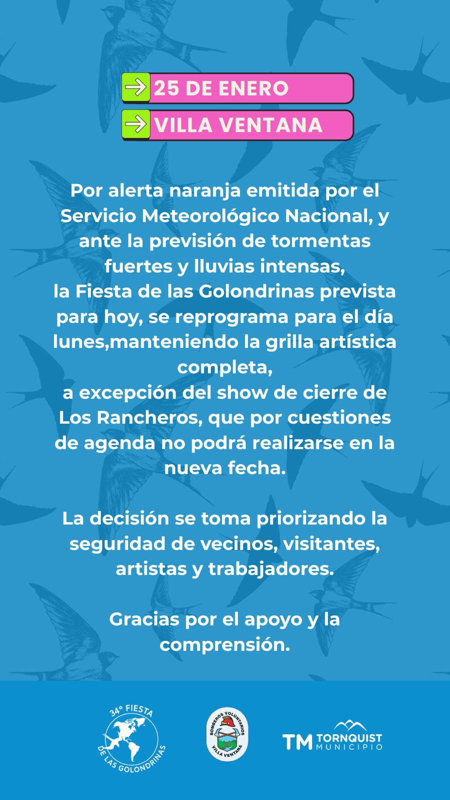 Los Bomberos Voluntarios de Villa Ventana informarán en las próximas horas si el evento se traslada a la jornada de mañana o si se define una nueva fecha, dependiendo estrictamente de la evolución del tiempo y la disponibilidad de los artistas.