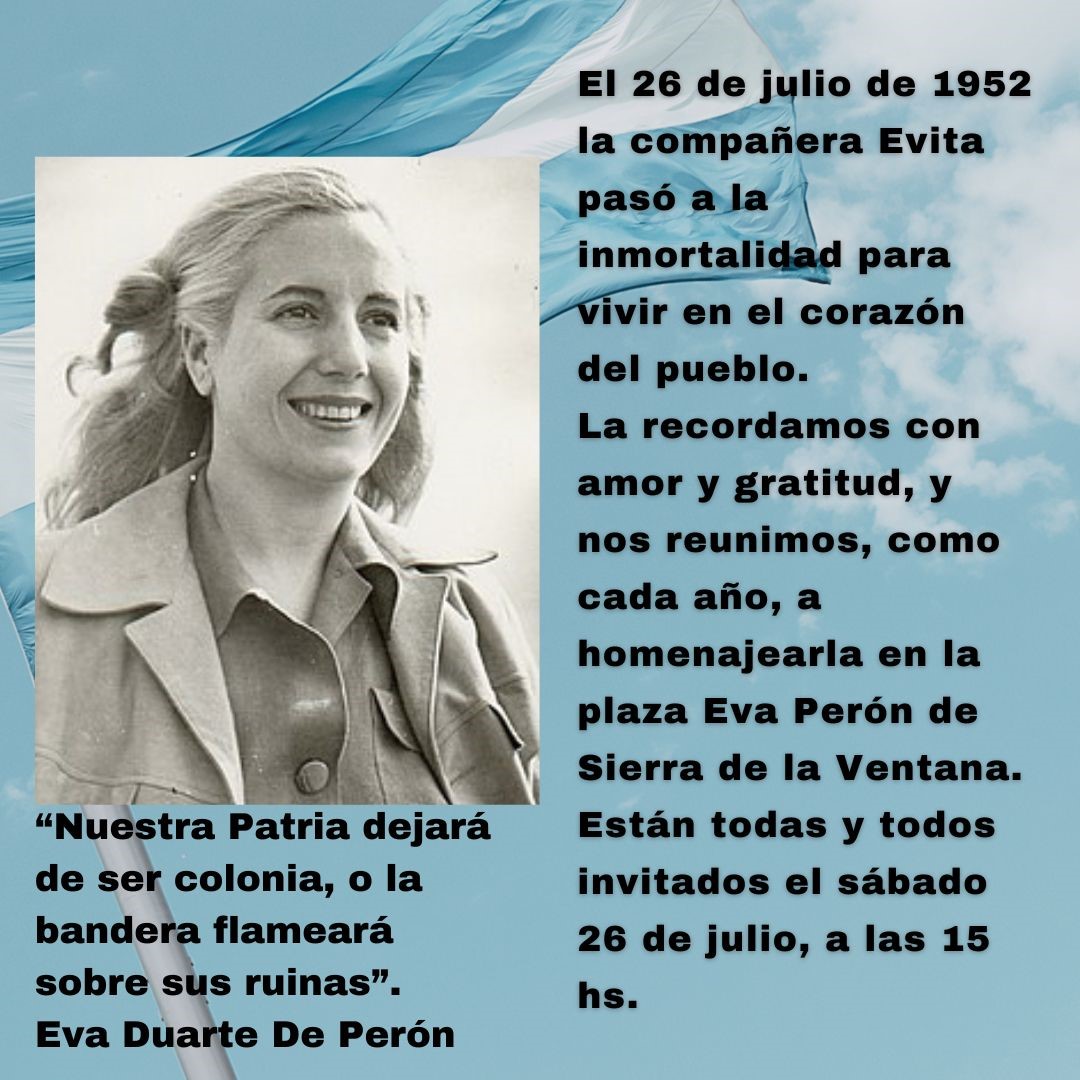 En el día que se cumple el aniversario del fallecimiento de Eva Perón, la comunidad de Sierra de la Ventana se reunirá una vez más y como cada 26 de julio, en la Plaza Eva Perón de Sierra de la Ventana para rendir homenaje a la inolvidable líder argentina.