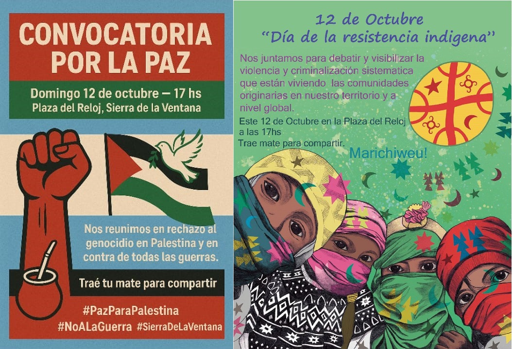 «El domingo 12 de octubre en la Plaza del Reloj, se realizarán dos convocatorias para reflexionar sobre la violencia y la criminalización que enfrentan las comunidades originarias y para exigir la paz en Palestina y en todo el mundo.