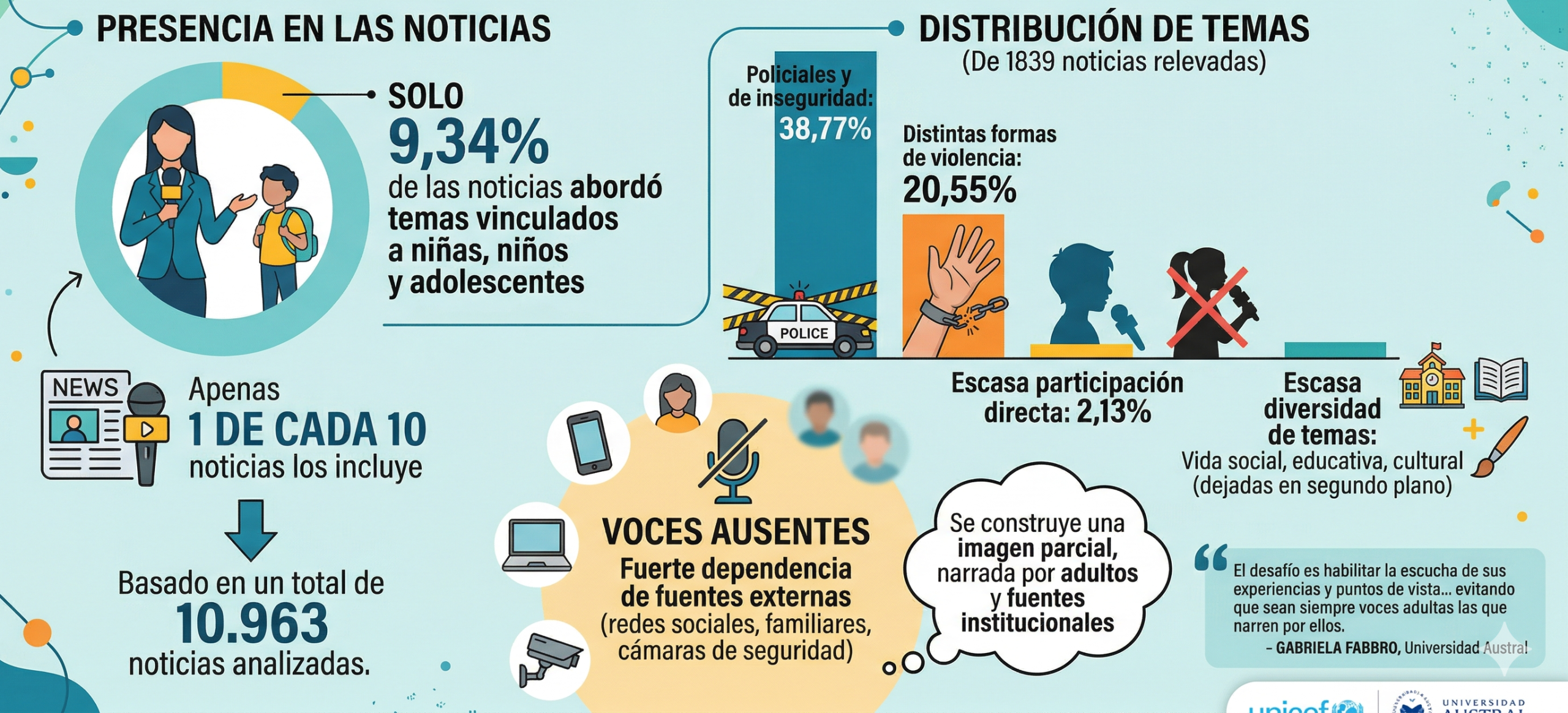 De casi 11.000 noticias analizadas por UNICEF y la Universidad Austral, menos del 3% incluyó la voz directa de niños o adolescentes. El estudio destaca que la mayoría de las coberturas sobre menores se vinculan a la inseguridad (38%) y la violencia, evidenciando una fuerte dependencia de fuentes secundarias y una escasa contextualización de sus realidades.