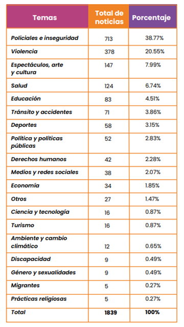 La distribución del total de noticias (1839)[1] con relación al agrupamiento temático general, ordenadas de menor a mayor, fue la siguiente: