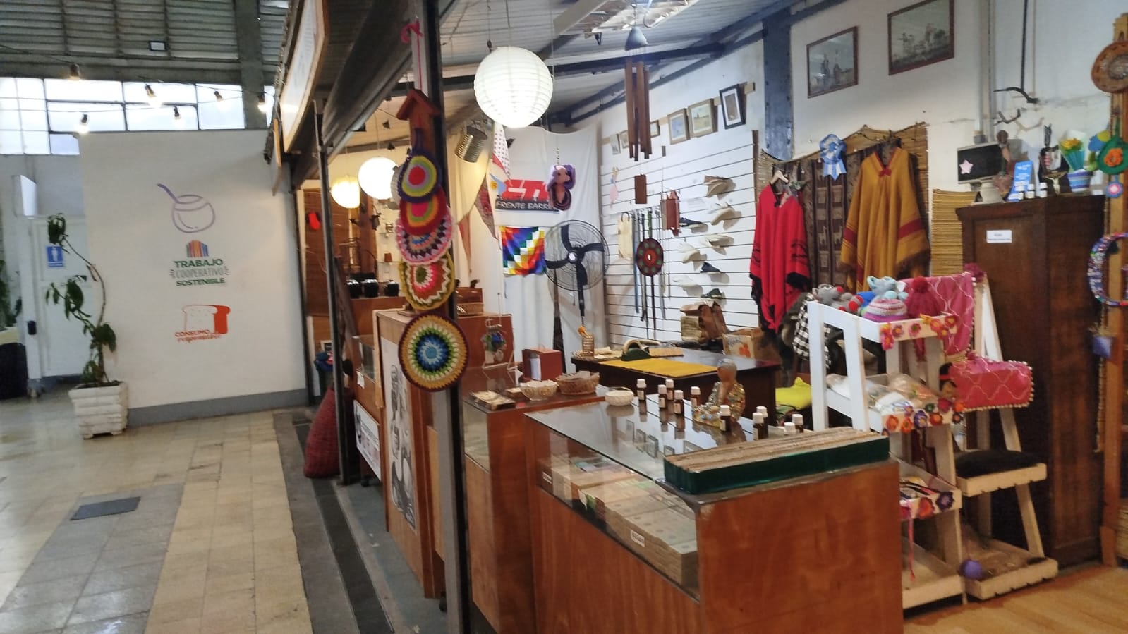 «Por otro lado, tenemos una pequeña producción de encurtidos, dulces, con nuestra marca, con librería, etc. Con todo eso abastecemos el mercado. Hay diez organizaciones, nosotros tenemos 3 unidades con el tamaño de un cuadrado de 3 metros x 3 metros. Hay unos 30 espacios que se replican ahí adentro en forma de U» menciona cómo es que trabajan también con la Cooperativa. «Yo te diría centenares de familias» responde cunado le consultamos cuántas familias trabajan con este tipo de cooperativa. «Hay productores agrícolas, textiles, de alimentos, si multiplicas se llega a 100 familias que viven y trabajan de eso».