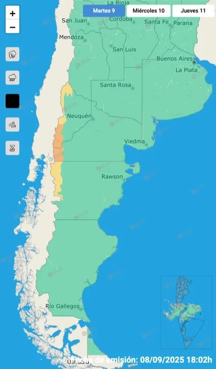 De esta manera, se mantenía este martes un alerta amarilla fuertes nevadas para zonas de la cordillera de Neuquén, Río Negro y Chubut. En algunos cosas, subía a alerta naranja.