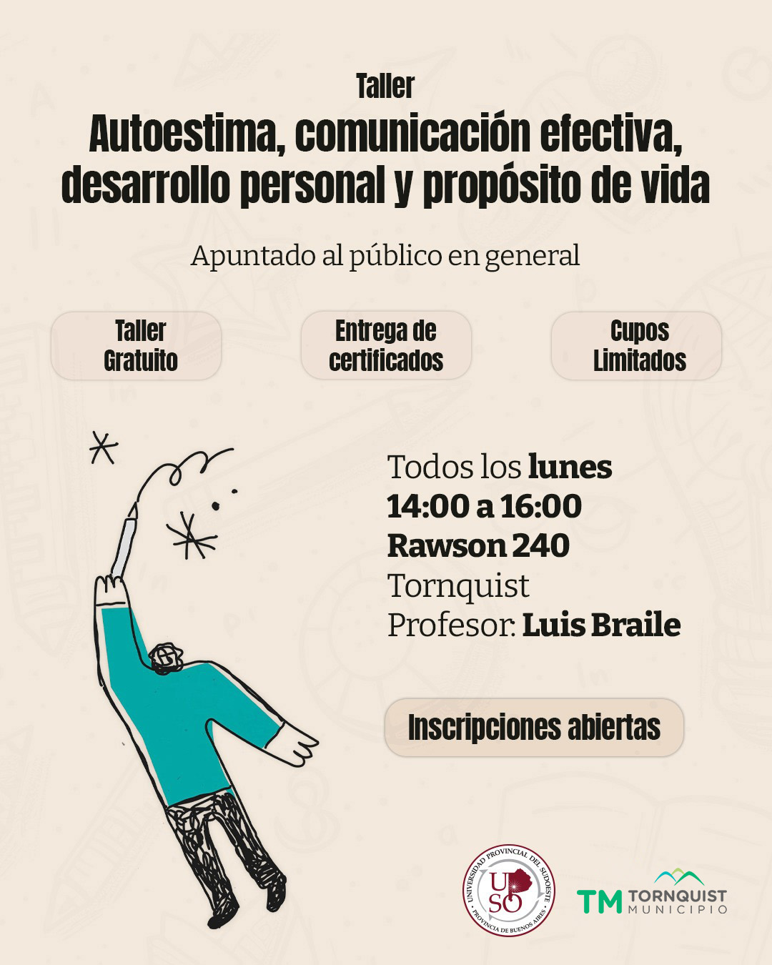 Tornquist Municipio junto a la Universidad Provincial del Sudoeste (UPSO), invita a la comunidad a participar del Taller de Autoestima, Comunicación Efectiva, Desarrollo Personal y Propósito de Vida, en el marco de los talleres de extensión universitaria.