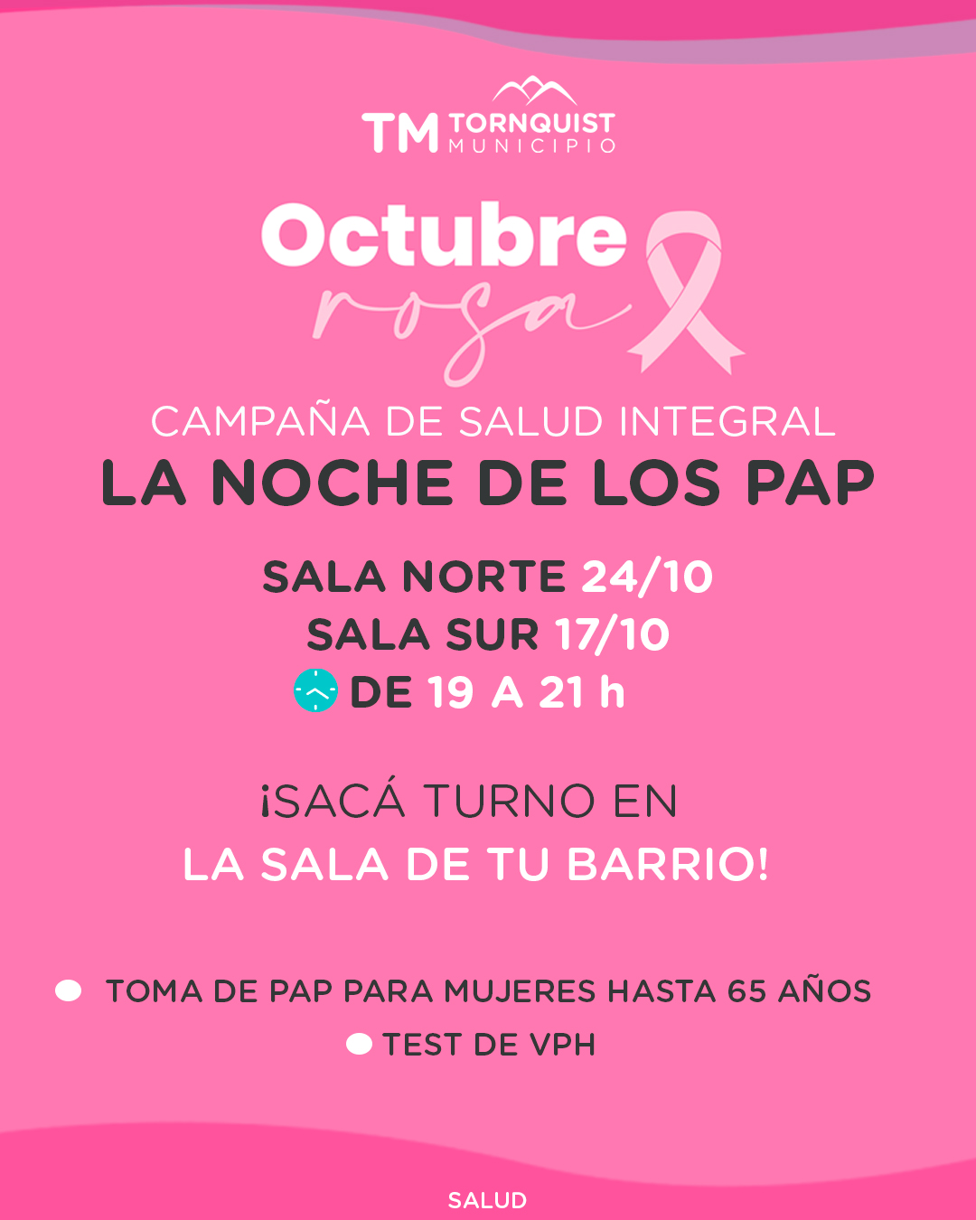 -La Noche de los PAP: una jornada especial destinada a la realización gratuita de Papanicolaou, para mujeres de hasta 65 años. El objetivo es facilitar el acceso al control ginecológico y fomentar la detección temprana del cáncer de cuello uterino. Se llevará a cabo el viernes 17/10 en Sala Sur y, el 24/10, en Sala Norte, ambos días de 19 a 21 h.
