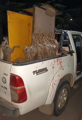 Se procedió al decomiso de 48 liebres, un rifle calibre 22, cargadores con municiones y cuchillos de caza. Las liebres decomisadas fueron entregadas a una entidad de bien público. Se instruyen actuaciones por infracción a los artículos 273 inciso F, 268 a 289 del Decreto Ley 10.081/83 del Código Rural con intervención del Ministerio de Asuntos Agrarios.