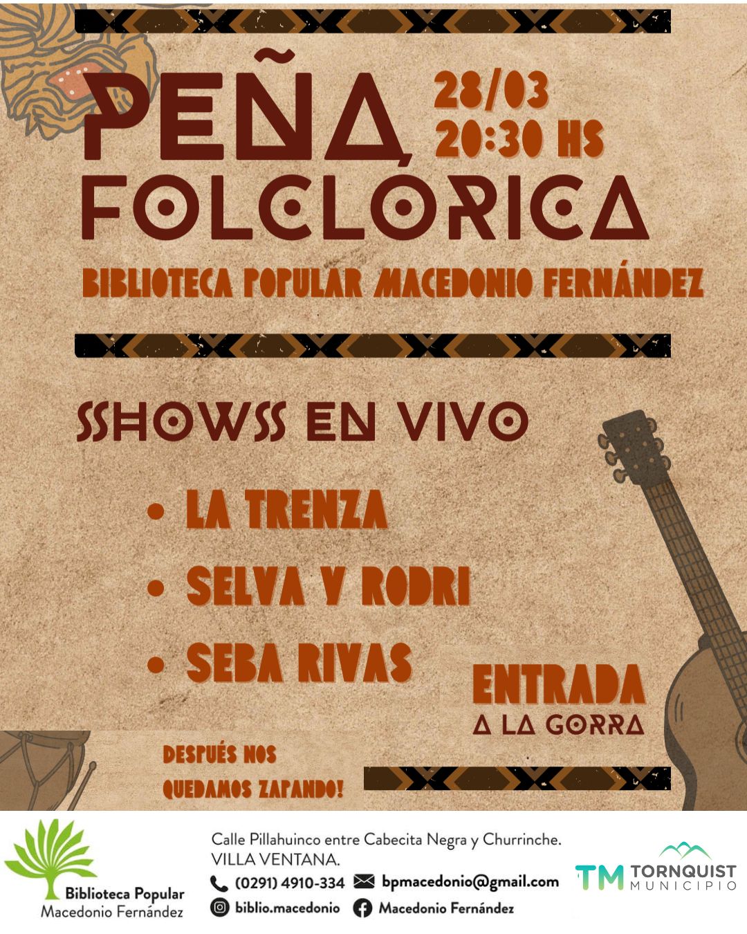 El fin de semana comienza con un gran «Sábado de Fogón». Este 28 de marzo a partir de las 20:30 horas, la biblioteca se transformará en una peña folclórica para compartir y disfrutar. Se presentarán «shows» en vivo de reconocidos artistas de la región: «La Trenza», «Selva y Rodri» y «Seba Rivas». Tras las actuaciones principales, la noche continuará con una «zapada» abierta para quienes deseen sumarse con sus instrumentos. La entrada es a la gorra y habrá una «cantina riquísima» a cargo de la institución.