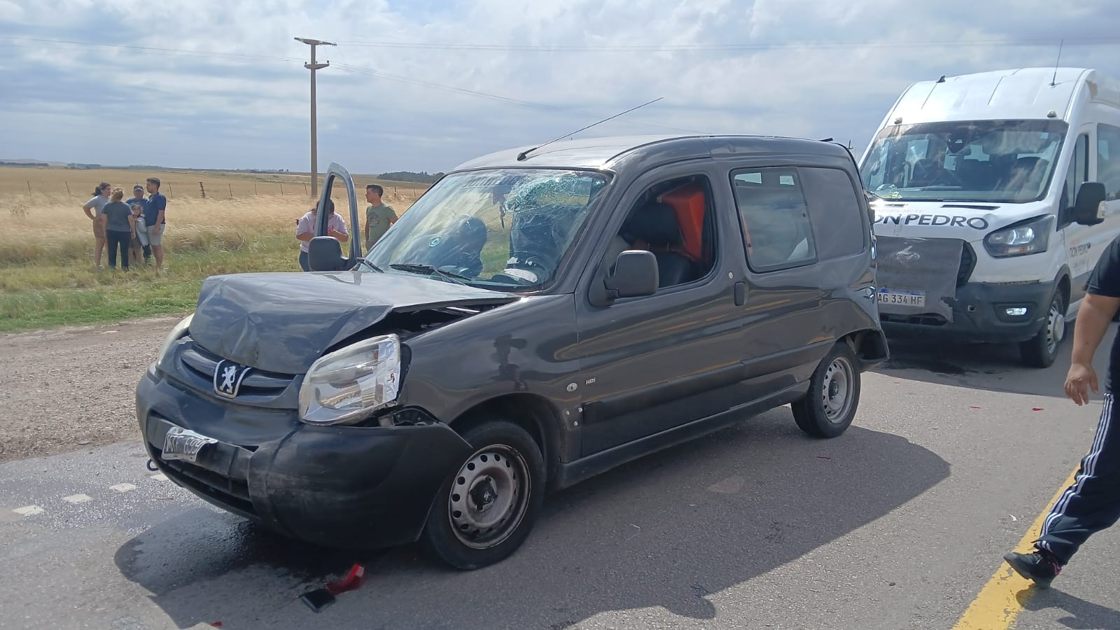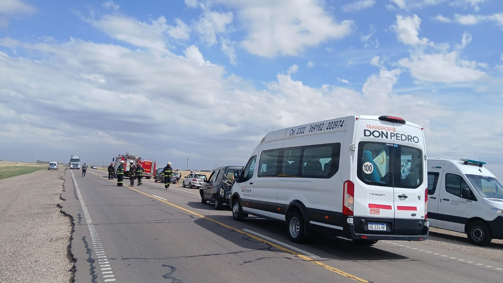 En el lugar, se constata colisión en cadena entre Peugeot 307 dominio ETV734 al mando de VIDELA JUAN PABLO (43 no residente), VW Suran dominio AD484FV conductor MENDOZA GRISELDA (46 años no residente), Peugeot Partner dominio MTF699 conducido por TOBARES ARIEL (48 no residente) y FORD Mini Bus dominio AG334HF conducido por FLORES MARIANELA (39 no residente), los cuales circulaban por Ruta Nacional 33 con sentido Bahía Blanca.