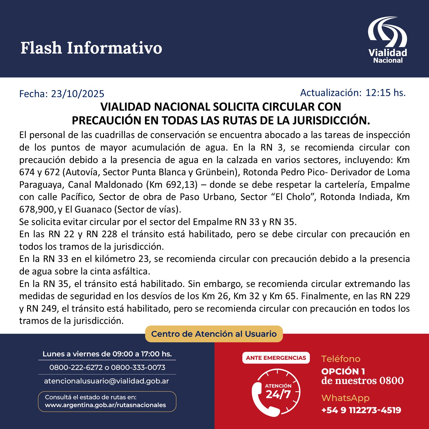 Vialidad, en tanto, aclaró que el tránsito en las rutas 3, 22, 33 y 35 está habilitado, cuando insistieron en transitar con precaución.