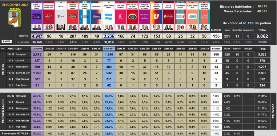 Según los resultados oficiales del escrutinio, La Libertad Avanza cosechó un total de 4.947 votos, mientras que la agrupación Fuerza Patria alcanzó los 3.236 votos. El análisis del recuento por mesa subraya la amplitud del triunfo, con un predominio constante de LLA en casi todos los circuitos electorales; Fuerza Patria solo logró imponerse en una única mesa (Mesa 1). Estos resultados evidencian un fuerte respaldo de los votantes de Tornquist al proyecto de La Libertad Avanza.