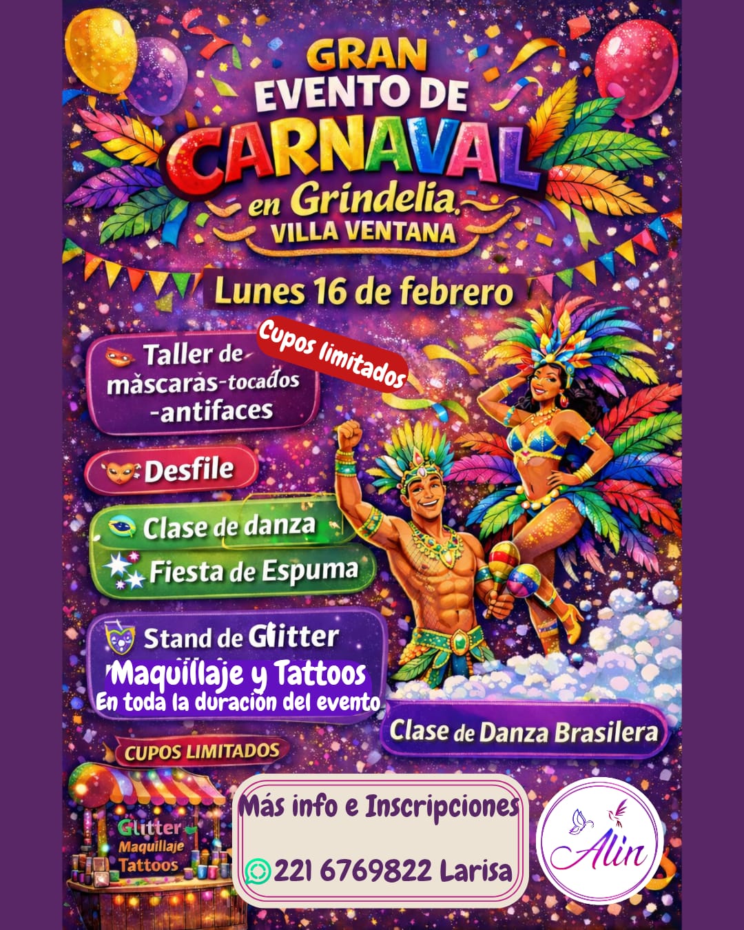 La magia del Carnaval llega a Villa Ventana con un evento diseñado para que grandes y chicos compartan una tarde llena de color, arte y alegría. El próximo festejo tendrá lugar en el emblemático patio de Grindelia, ofreciendo una experiencia integral que combina talleres creativos, danza y un cierre espectacular.
