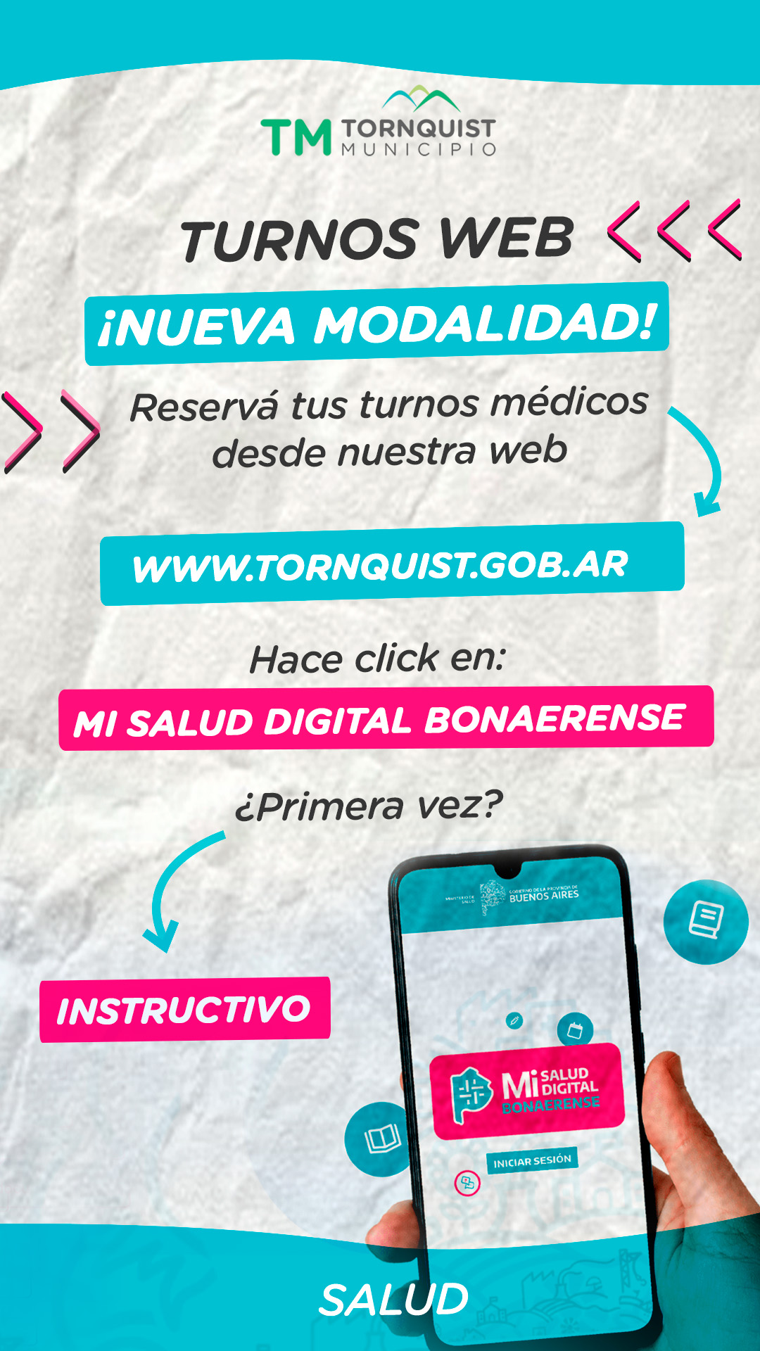 Las citas se gestionan a través del portal web del municipio, https://tornquist.gob.ar/, ingresando al sitio ‘Turnos web Salud’ y siguiendo las indicaciones.